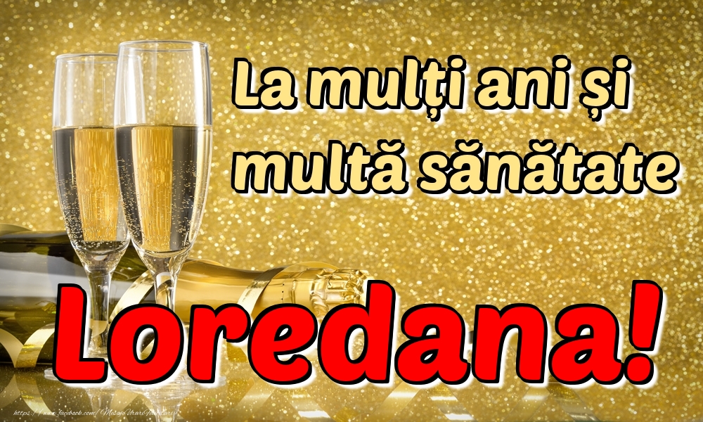 La mulți ani multă sănătate Loredana! | Felicitare cu șampanie cu pahare pe fundal auriu | Felicitari de la multi ani