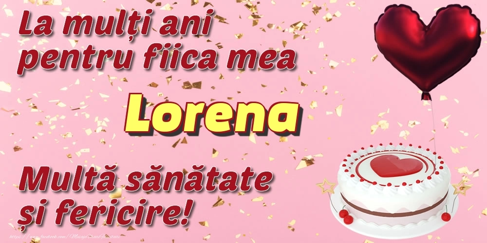 La mulți ani pentru fiica mea Lorena Multă sănătate și fericire! | Felicitare cu baloan în formă de inimă și tort cu inimioare | Felicitari de zi de nastere