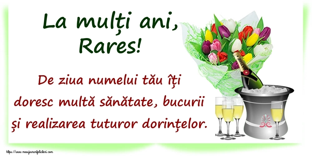 Această felicitare cu buchet de lalele și șampanie pentru femei din colecția noastră de felicitari de ziua numelui cu numele Rares are o notă de originalitate și îți oferă ocazia să faci o persoană să se simtă specială datorită faptului că acolo este numele ei. Felicitarea se poate descărca gratuit sau se poate trimite prin Whatsapp, Facebook, Twitter, Pinterest. Imagine de ziua onomastică cu buchet de lalele și șampanie pentru femei cu dimensiunile 1000px x 500px și cu textul La mulți ani, Rares! De ziua numelui tău îți doresc multă sănătate, bucurii și realizarea tuturor dorințelor..