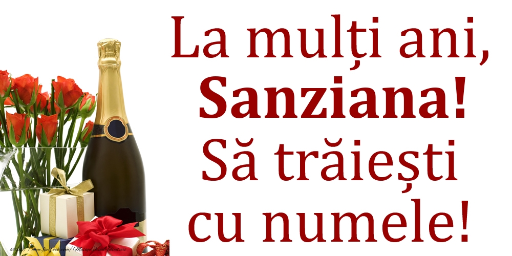 La mulți ani, Sanziana! Să trăiești cu numele! | Felicitare cu cadou, flori și șampanie | Felicitari de Ziua Numelui