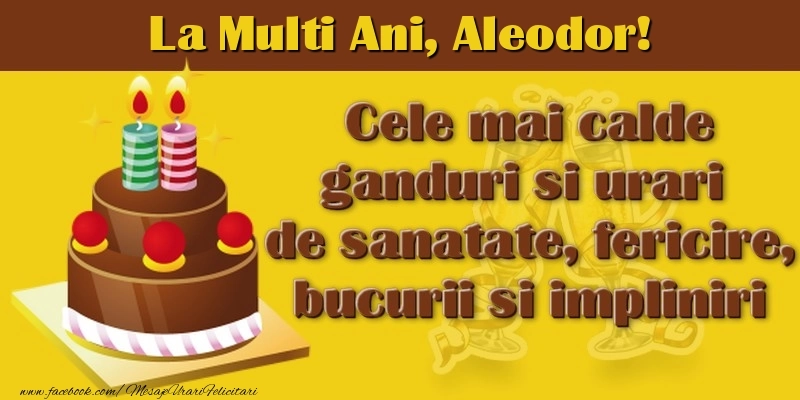 Această felicitare cu tort pentru femei sau bărbați din colecția noastră de felicitari de la multi ani cu numele Aleodor are o notă de originalitate și îți oferă ocazia să faci o persoană să se simtă specială datorită faptului că acolo este numele ei. Felicitarea se poate descărca gratuit sau se poate trimite prin Whatsapp, Facebook, Twitter, Pinterest. Imagine de la mulți ani cu tort pentru femei sau bărbați cu dimensiunile 800px x 400px și cu textul La multi ani, Aleodor!.