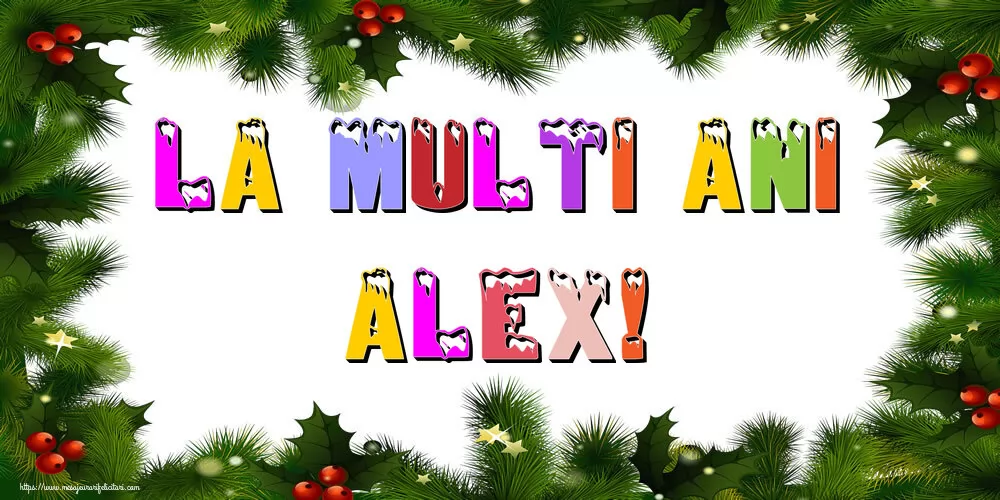 Această felicitare cu chenar din brad de sărbători din colecția noastră de felicitari de Anul Nou cu numele Alex are o notă de originalitate și îți oferă ocazia să faci o persoană să se simtă specială datorită faptului că acolo este numele ei. Felicitarea se poate descărca gratuit sau se poate trimite prin Whatsapp, Facebook, Twitter, Pinterest. Imagine de Anul Nou cu chenar din brad de sărbători cu dimensiunile 1000px x 500px și cu textul La multi ani Alex!.