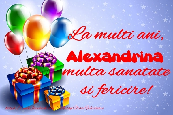 Felicitarea cu baloane și cadouri pe fundal albastru cu steluțe este ca o explozie de bucurie și culoare, iar numele Alexandrina este adăugat cu gingășie pentru a personaliza această experiență de sărbătoare. Este modul tău de a spune la mulți ani într-un mod unic și special!