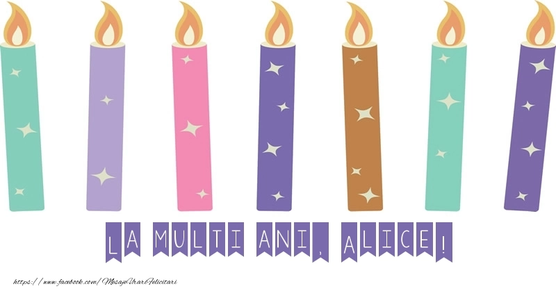 Cu mesajul potrivit adăugat pentru a transmite cele mai sincere urări, această felicitare cu desen cu lumânări colorate devine o modalitate perfectă de a sărbători momentul special al unei zile de naștere. Felicitarea pentru Alice se poate descărca gratuit sau se poate trimite prin Whatsapp, Facebook, Twitter, Pinterest. Imaginea are dimensiunile 800px x 419px și textul La multi ani, Alice!.