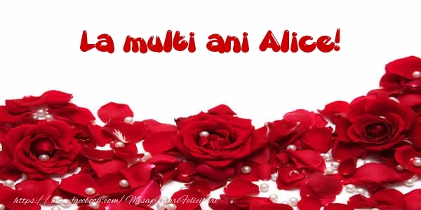 Această felicitare cu trandafiri roșii pe fundal alb din colecția noastră de felicitari de la multi ani cu numele Alice are o notă de originalitate și îți oferă ocazia să faci o persoană să se simtă specială datorită faptului că acolo este numele ei. Felicitarea se poate descărca gratuit sau se poate trimite prin Whatsapp, Facebook, Twitter, Pinterest. Imagine de la mulți ani cu trandafiri roșii pe fundal alb cu dimensiunile 600px x 300px și cu textul La multi ani Alice!.