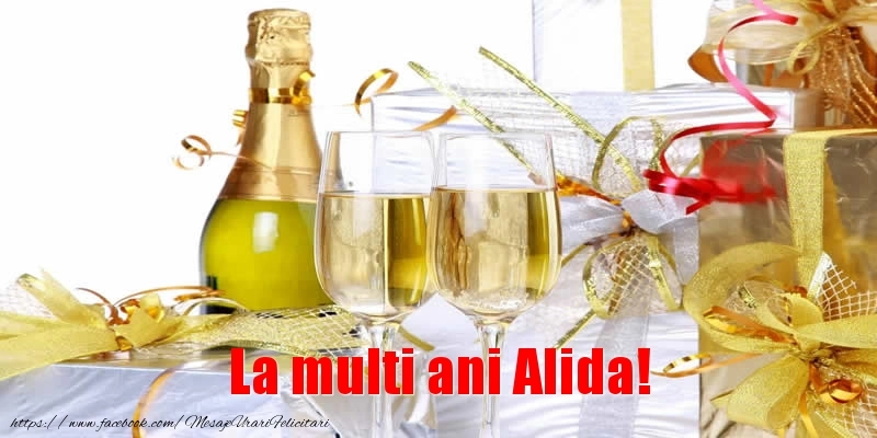 Felicitarea cu șampanie cu 2 pahare și cadouri este ca o explozie de bucurie și culoare, iar numele Alida este adăugat cu gingășie pentru a personaliza această experiență de sărbătoare. Este modul tău de a spune la mulți ani într-un mod unic și special!