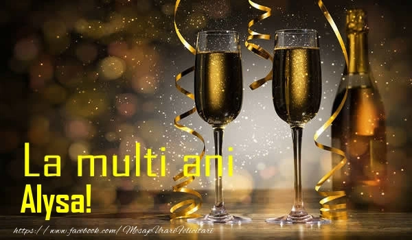 Felicitarea cu șampanie pe fundal cu auriu este ca o explozie de bucurie și culoare, iar numele Alysa este adăugat cu gingășie pentru a personaliza această experiență de sărbătoare. Este modul tău de a spune la mulți ani într-un mod unic și special!