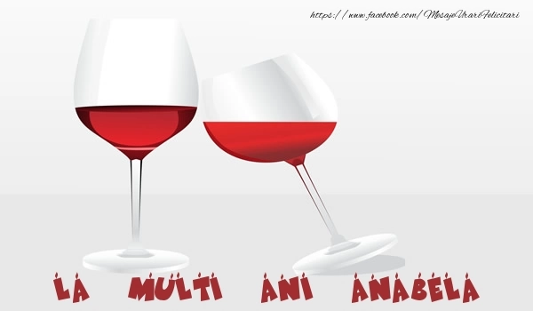 Această felicitare cu doua pahare de vin roșu care se ciocnesc din colecția noastră de felicitari de la multi ani cu numele Anabela are o notă de originalitate și îți oferă ocazia să faci o persoană să se simtă specială datorită faptului că acolo este numele ei. Felicitarea se poate descărca gratuit sau se poate trimite prin Whatsapp, Facebook, Twitter, Pinterest. Imagine de la mulți ani cu doua pahare de vin roșu care se ciocnesc cu dimensiunile 600px x 350px și cu textul La multi ani Anabela.