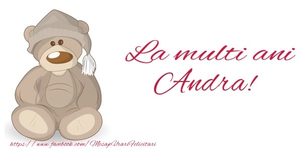 Această felicitare cu ursuleț simpatic din colecția noastră de felicitari de la multi ani cu numele Andra are o notă de originalitate și îți oferă ocazia să faci o persoană să se simtă specială datorită faptului că acolo este numele ei. Felicitarea se poate descărca gratuit sau se poate trimite prin Whatsapp, Facebook, Twitter, Pinterest. Imagine de la mulți ani cu ursuleț simpatic cu dimensiunile 600px x 300px și cu textul La multi ani Andra!.