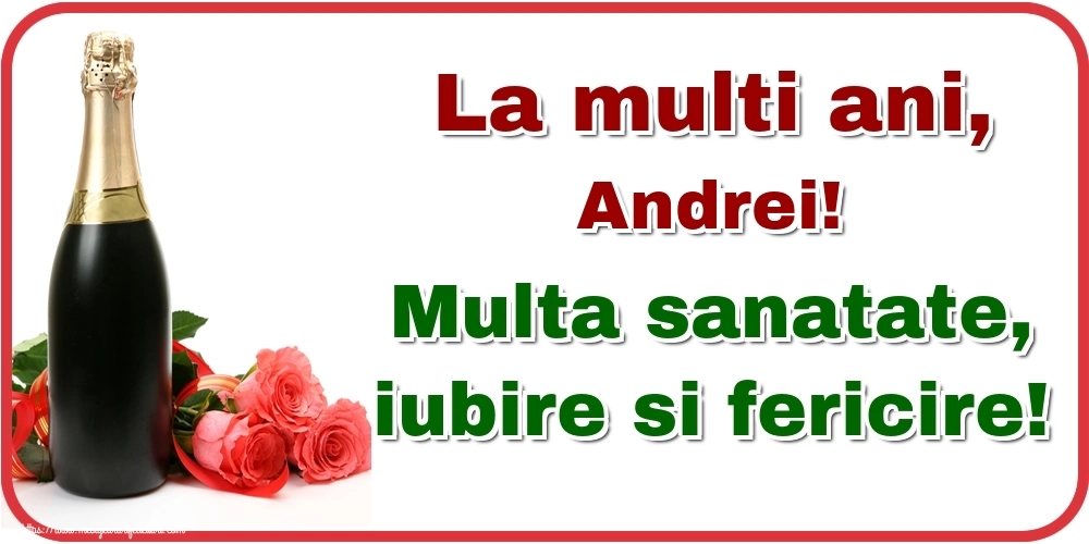 Felicitarea cu trandafiri și șampanie pe fundal alb cu chenar roșu este ca o explozie de bucurie și culoare, iar numele Andrei este adăugat cu gingășie pentru a personaliza această experiență de sărbătoare. Este modul tău de a spune la mulți ani într-un mod unic și special!