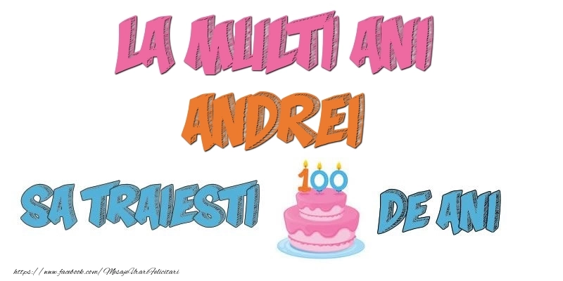 Această felicitare cu tort cu 100 din colecția noastră de felicitari de zi de nastere cu numele Andrei are o notă de originalitate și îți oferă ocazia să faci o persoană să se simtă specială datorită faptului că acolo este numele ei. Felicitarea se poate descărca gratuit sau se poate trimite prin Whatsapp, Facebook, Twitter, Pinterest. Imagine de zi de nastere cu tort cu 100 cu dimensiunile 800px x 400px și cu textul La multi ani, Andrei! Sa traiesti 100 de ani!.