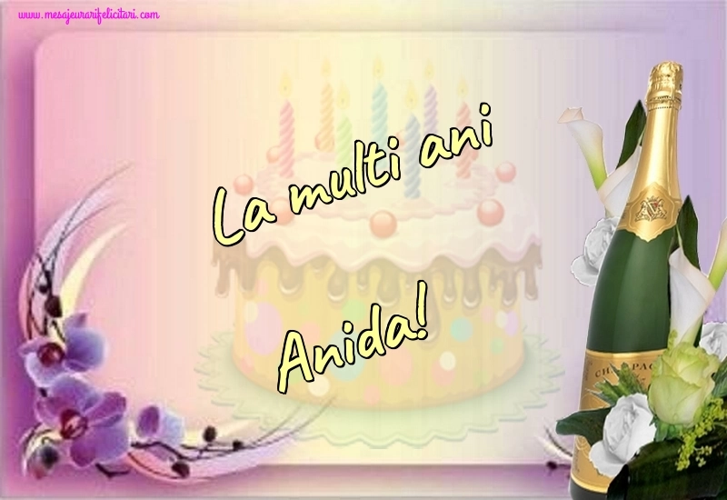 Felicitarea cu șampanie cu tort în fundal este ca o explozie de bucurie și culoare, iar numele Anida este adăugat cu gingășie pentru a personaliza această experiență de sărbătoare. Este modul tău de a spune la mulți ani într-un mod unic și special!