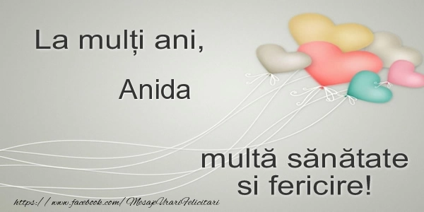 Această felicitare cu baloane inimioare din colecția noastră de felicitari de la multi ani cu numele Anida are o notă de originalitate și îți oferă ocazia să faci o persoană să se simtă specială datorită faptului că acolo este numele ei. Felicitarea se poate descărca gratuit sau se poate trimite prin Whatsapp, Facebook, Twitter, Pinterest. Imagine de la mulți ani cu baloane inimioare cu dimensiunile 600px x 300px și cu textul La multi ani, Anida multa sanatate si fericire!.