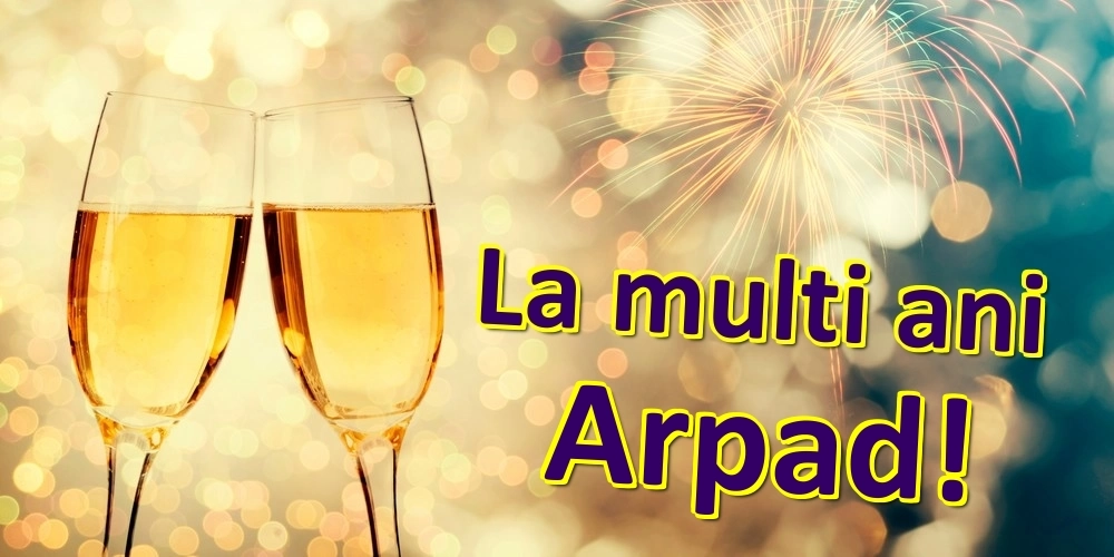 Felicitarea cu pahare de șampanie și artificii este un cadou care sărbătorește bucuria și realizările și va rămâne o amintire frumoasă pentru mult timp de acum înainte. Felicitarea pentru Arpad se poate descărca gratuit sau se poate trimite prin Whatsapp, Facebook, Twitter, Pinterest. Imaginea de zi de naștere cu pahare de șampanie și artificii are dimensiunile 1000px x 500px și textul La multi ani Arpad!.