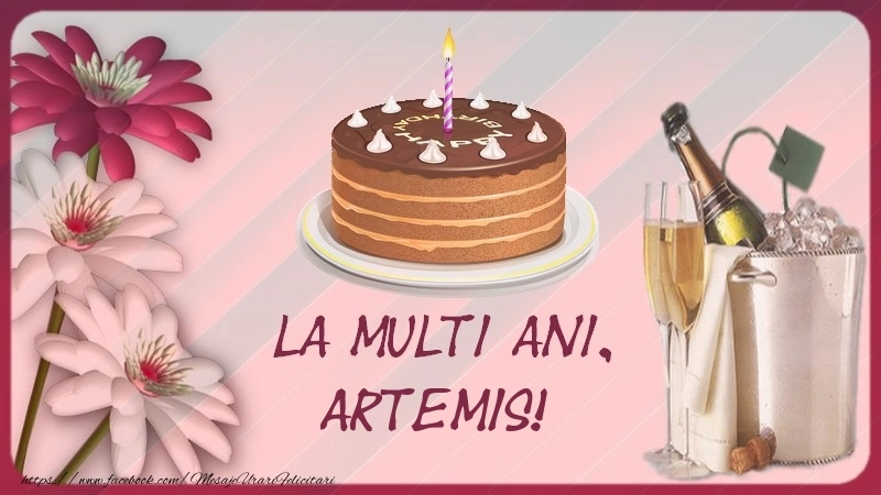 Felicitarea cu flori și șampanie în frapieră este ca o explozie de bucurie și culoare, iar numele Artemis este adăugat cu gingășie pentru a personaliza această experiență de sărbătoare. Este modul tău de a spune la mulți ani într-un mod unic și special!