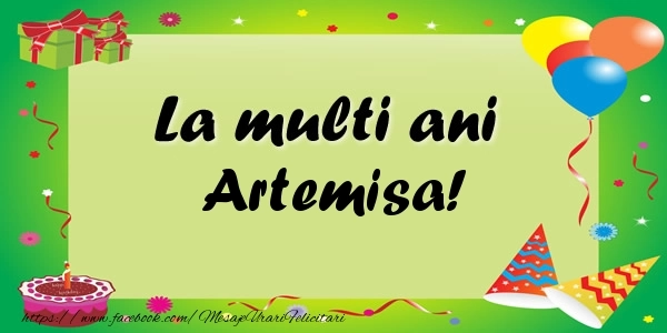 Felicitarea cu baloane, confetti și tort pe fundal verde este un cadou mic, dar personal, creat special pentru ziua de naștere. Numele Artemisa e esența acestui cadou, aducând bucurie într-un mod simplu și intim.