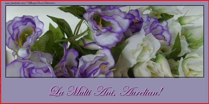 Felicitarea cu flori pe fundal mov este ca o explozie de bucurie și culoare, iar numele Aurelian este adăugat cu gingășie pentru a personaliza această experiență de sărbătoare. Este modul tău de a spune la mulți ani într-un mod unic și special!