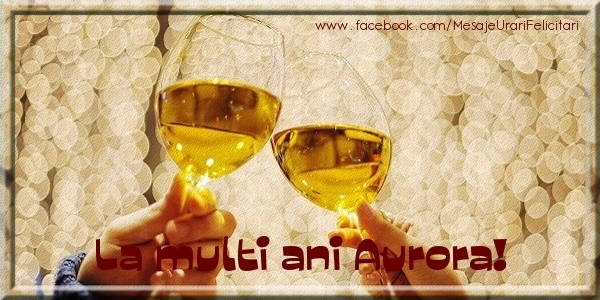 Această felicitare cu pahare de șampanie in mâini din colecția noastră de felicitari de la multi ani cu numele Aurora are o notă de originalitate și îți oferă ocazia să faci o persoană să se simtă specială datorită faptului că acolo este numele ei. Felicitarea se poate descărca gratuit sau se poate trimite prin Whatsapp, Facebook, Twitter, Pinterest. Imagine de la mulți ani cu pahare de șampanie in mâini cu dimensiunile 600px x 300px și cu textul La multi ani Aurora.