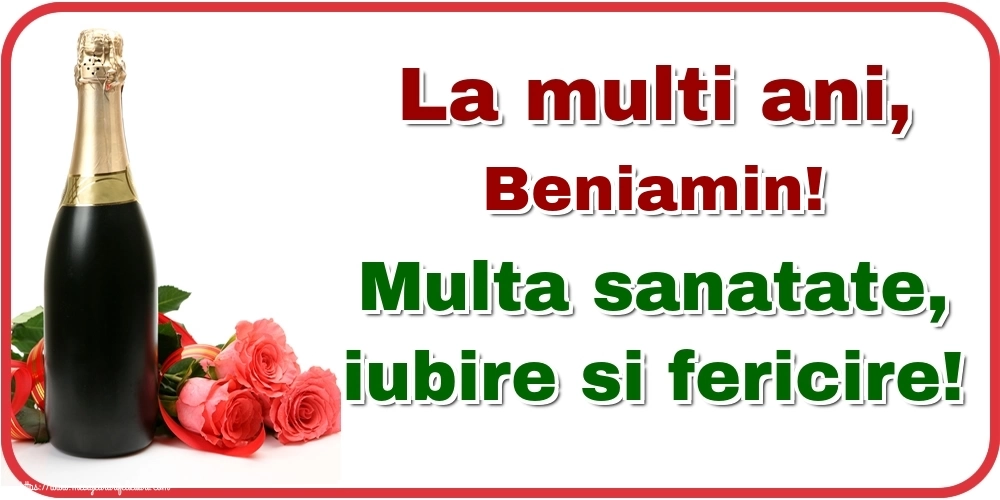 Felicitarea cu trandafiri și șampanie pe fundal alb cu chenar roșu este ca o explozie de bucurie și culoare, iar numele Beniamin este adăugat cu gingășie pentru a personaliza această experiență de sărbătoare. Este modul tău de a spune la mulți ani într-un mod unic și special!