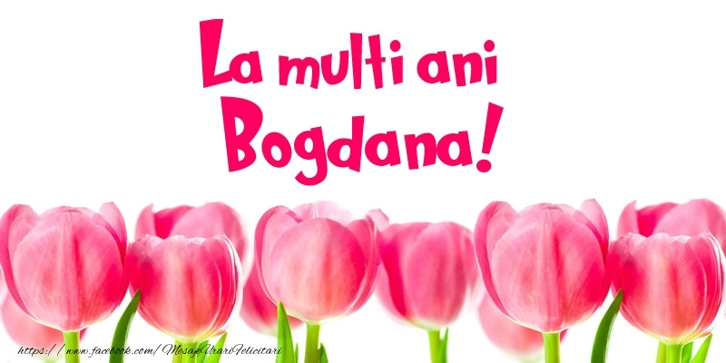 Această felicitare cu lalele roz pe fundal din colecția noastră de felicitari de la multi ani cu numele Bogdana are o notă de originalitate și îți oferă ocazia să faci o persoană să se simtă specială datorită faptului că acolo este numele ei. Felicitarea se poate descărca gratuit sau se poate trimite prin Whatsapp, Facebook, Twitter, Pinterest. Imagine de la mulți ani cu lalele roz pe fundal cu dimensiunile 800px x 400px și cu textul La multi ani Bogdana!.