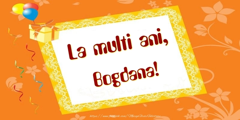 Celebrează ziua de naștere a cuiva drag într-un mod plin de veselie și surprize cu felicitarea cu numele Bogdana, care aduce un aranjament de baloane colorate și un cadou special, pregătit să aducă un strop de bucurie și emoție în ziua lor de naștere! Felicitarea cu se poate descărca gratuit sau se poate trimite prin Whatsapp, Facebook, Twitter, Pinterest. Imaginea cu baloane și cadou are dimensiunile 800px x 400px și textul La multi ani, Bogdana!.