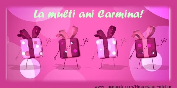 Această felicitare cu cadouri dansatoare din colecția noastră de felicitari de la multi ani cu numele Carmina are o notă de originalitate și îți oferă ocazia să faci o persoană să se simtă specială datorită faptului că acolo este numele ei. Felicitarea se poate descărca gratuit sau se poate trimite prin Whatsapp, Facebook, Twitter, Pinterest. Imagine de la mulți ani cu cadouri dansatoare cu dimensiunile 600px x 300px și cu textul La multi ani Carmina!.