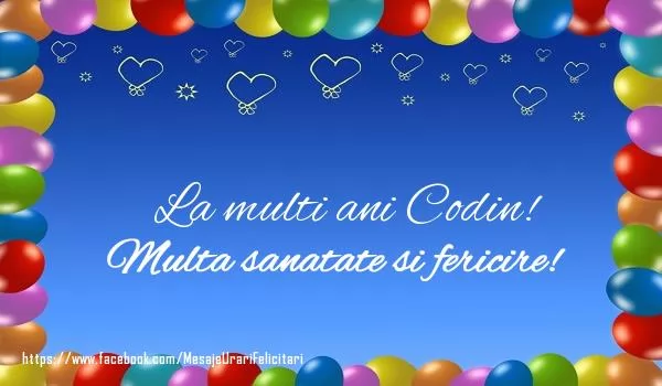 Felicitarea cu inimioare și chenar cu baloane este ca o explozie de bucurie și culoare, iar numele Codin este adăugat cu gingășie pentru a personaliza această experiență de sărbătoare. Este modul tău de a spune la mulți ani într-un mod unic și special!
