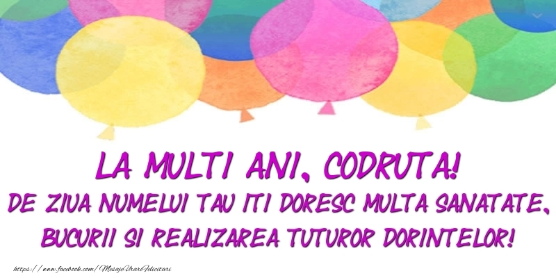 Această felicitare cu baloane colorate pentru sărbătoriți din colecția noastră de felicitari de ziua numelui cu numele Codruta are o notă de originalitate și îți oferă ocazia să faci o persoană să se simtă specială datorită faptului că acolo este numele ei. Felicitarea se poate descărca gratuit sau se poate trimite prin Whatsapp, Facebook, Twitter, Pinterest. Imagine de ziua onomastică cu baloane colorate pentru sărbătoriți cu dimensiunile 800px x 400px și cu textul La multi ani, Codruta! De ziua numelui tau iti doresc multa sanatate, bucurii si realizarea tuturor dorintelor!.