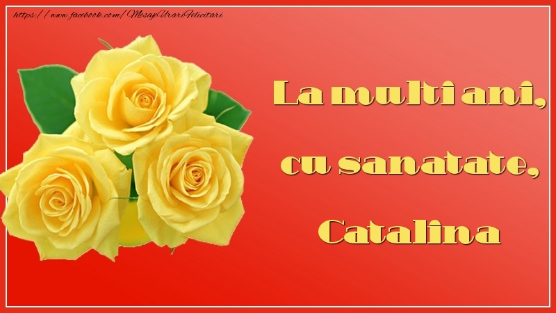 La multi ani, cu sanatate, Catalina | Felicitare cu trandafiri galbeni pe fundal roșu | Felicitari de la multi ani