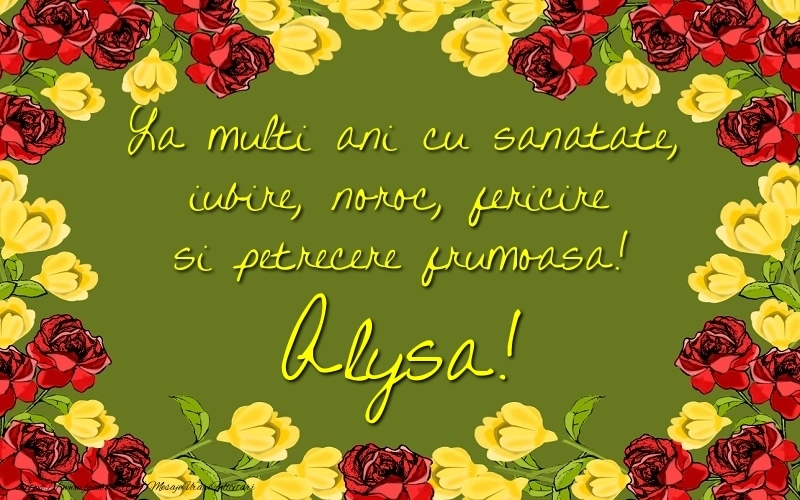 La multi ani cu sanatate, iubire, noroc, fericire si petrecere frumoasa! Alysa | Felicitare cu chenar din trandafiri roșii și galbeni | Felicitari de la multi ani