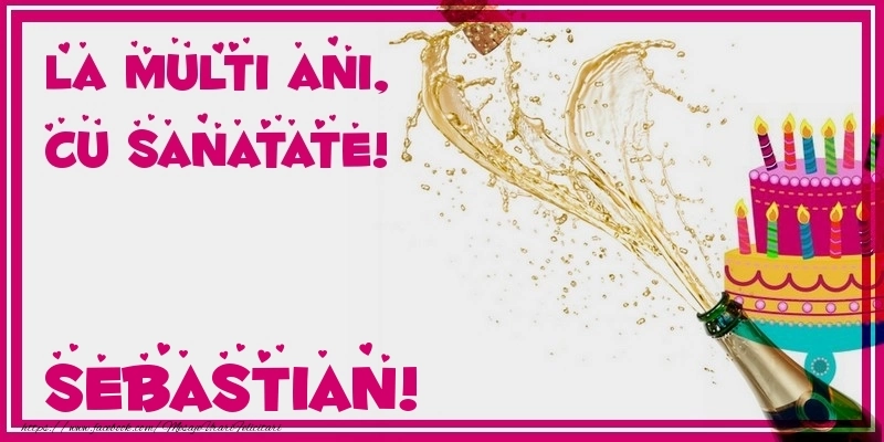 Această felicitare cu șampanie și desen cu tort din colecția noastră de felicitari de zi de nastere cu numele Sebastian are o notă de originalitate și îți oferă ocazia să faci o persoană să se simtă specială datorită faptului că acolo este numele ei. Felicitarea se poate descărca gratuit sau se poate trimite prin Whatsapp, Facebook, Twitter, Pinterest. Imagine de zi de nastere cu șampanie și desen cu tort cu dimensiunile 800px x 400px și cu textul La multi ani, cu sanatate! Sebastian.