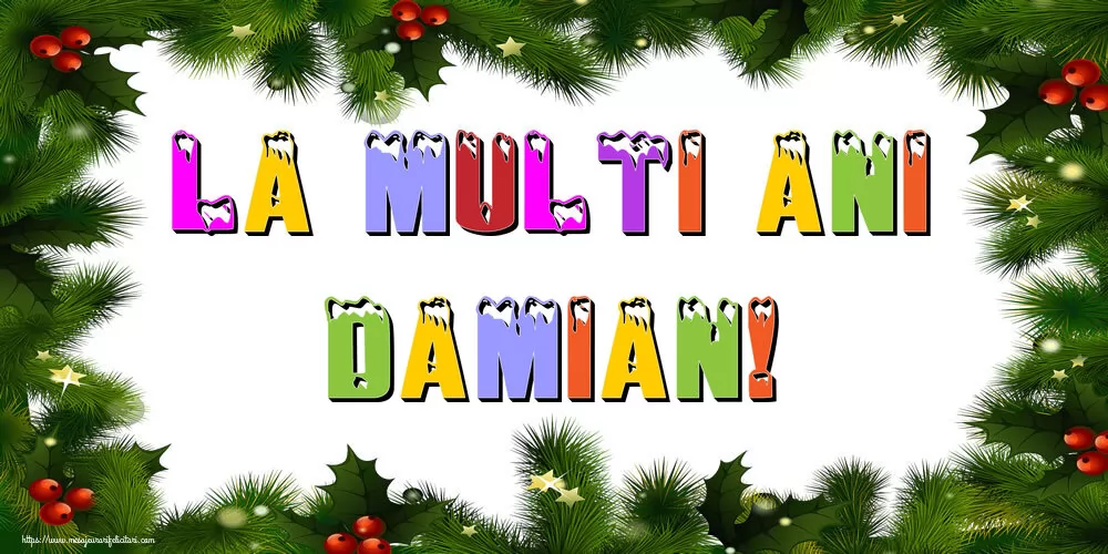 Această felicitare cu chenar din brad de sărbători din colecția noastră de felicitari de Anul Nou cu numele Damian are o notă de originalitate și îți oferă ocazia să faci o persoană să se simtă specială datorită faptului că acolo este numele ei. Felicitarea se poate descărca gratuit sau se poate trimite prin Whatsapp, Facebook, Twitter, Pinterest. Imagine de Anul Nou cu chenar din brad de sărbători cu dimensiunile 1000px x 500px și cu textul La multi ani Damian!.