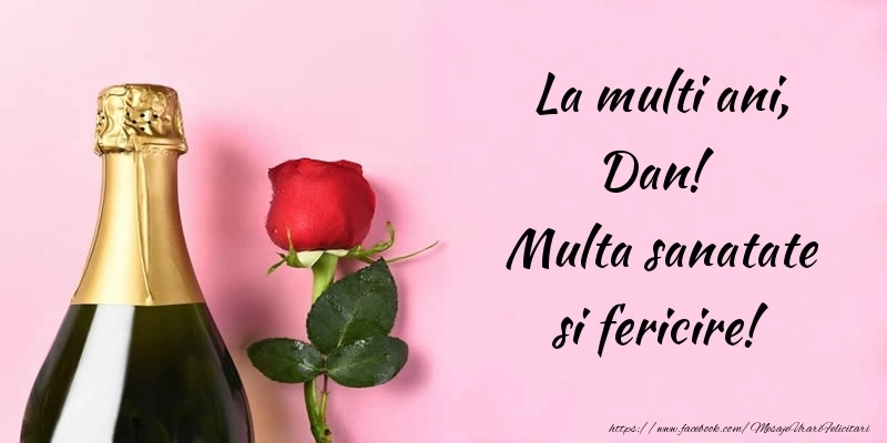 Această felicitare cu 1 trandafir și 1 șampanie din colecția noastră de felicitari de la multi ani cu numele Dan are o notă de originalitate și îți oferă ocazia să faci o persoană să se simtă specială datorită faptului că acolo este numele ei. Felicitarea se poate descărca gratuit sau se poate trimite prin Whatsapp, Facebook, Twitter, Pinterest. Imagine de la mulți ani cu 1 trandafir și 1 șampanie cu dimensiunile 800px x 400px și cu textul La multi ani, Dan! Multa sanatate si fericire!.