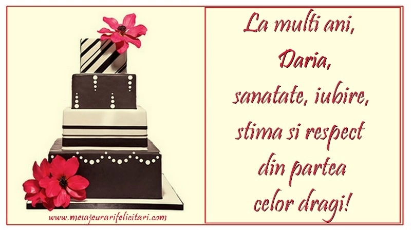 Cu un design adorabil ce îmbină un desen vesel al unui tort festiv cu delicatele floricele, această felicitare cu numele Daria este o modalitate perfectă de a sărbători ziua specială a cuiva drag.
