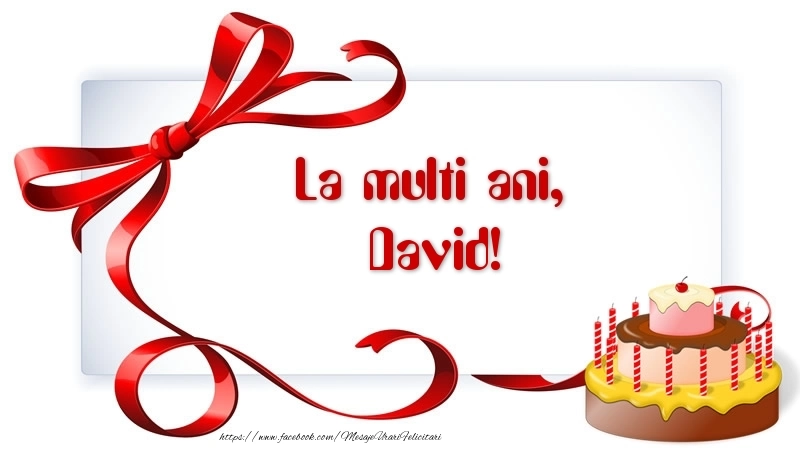 Cu fiecare lumânare aprinsă, se vor împlini dorințele cele mai dulci și visele cele mai frumoase pentru anii ce vor urma. Cu un design atrăgător și plin de culoare, această felicitare cu tort cu lumânări promite să transforme ziua de naștere într-un moment de neuitat. Felicitarea se poate descărca gratuit sau se poate trimite prin Whatsapp, Facebook, Twitter, Pinterest. Imaginea are dimensiunile 800px x 450px și textul La multi ani, David!.