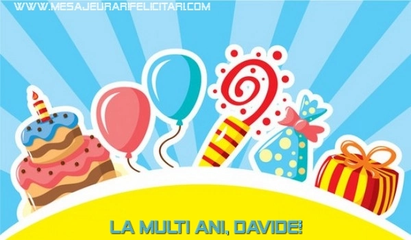 Felicitarea cu baloane, cadou, tort și bomboane este ca o explozie de bucurie și culoare, iar numele Davide este adăugat cu gingășie pentru a personaliza această experiență de sărbătoare. Este modul tău de a spune la mulți ani într-un mod unic și special!