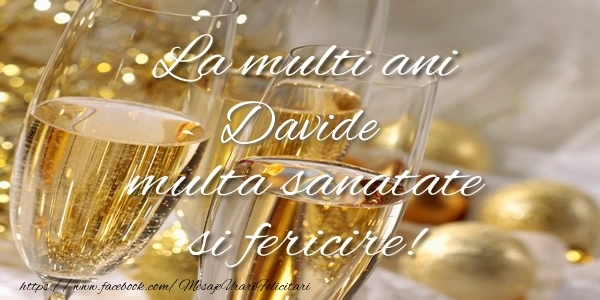 Felicitarea cu pahare de șampanie și ornamente cu globuri este ca o explozie de bucurie și culoare, iar numele Davide este adăugat cu gingășie pentru a personaliza această experiență de sărbătoare. Este modul tău de a spune la mulți ani într-un mod unic și special!