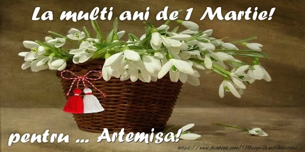 Această felicitare cu ghiocei in cos de nuiele si snur martisor din colecția noastră de felicitari de Martisor cu numele Artemisa are o notă de originalitate și îți oferă ocazia să faci o persoană să se simtă specială datorită faptului că acolo este numele ei. Felicitarea se poate descărca gratuit sau se poate trimite prin Whatsapp, Facebook, Twitter, Pinterest. Imagine de 1 Martie cu ghiocei in cos de nuiele si snur martisor cu dimensiunile 600px x 300px și cu textul La multi ani de 1 Martie! pentru Artemisa.