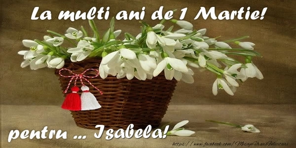 Transformă Mărțișorul într-o experiență personală! Această felicitare de 1 Martie cu ghiocei in cos de nuiele si snur martisor este gândită și creată cu atenție, iar numele Isabela se îmbină armonios în designul primăvăratic. O urare cu adevărat specială pentru o persoană unică.