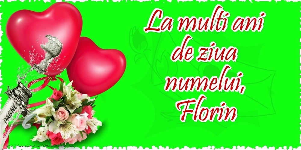 La multi ani de ziua numelui, Florin | Felicitare cu flori, inimioare și șampanie | Felicitari de Ziua Numelui