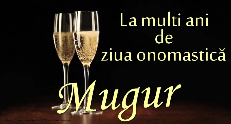 Felicitarea cu pahare de sampanie pe fundal negru de Ziua Numelui este un cadou gândit special pentru sărbătoare numelui Mugur. Numele Mugur devine piesa centrală a acestui dar unic, aducând sărbătoriților un strop de bucurie în aceată zi specială.