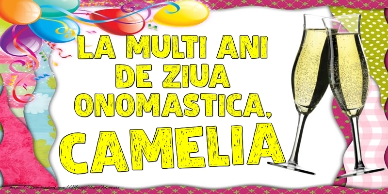 Felicitarea cu baloane și șampanie de Ziua Numelui este un cadou gândit special pentru sărbătoare numelui Camelia. Numele Camelia devine piesa centrală a acestui dar unic, aducând sărbătoriților un strop de bucurie în aceată zi specială.