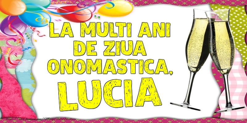 Această felicitare cu baloane și șampanie din colecția noastră de felicitari de ziua numelui cu numele Lucia are o notă de originalitate și îți oferă ocazia să faci o persoană să se simtă specială datorită faptului că acolo este numele ei. Felicitarea se poate descărca gratuit sau se poate trimite prin Whatsapp, Facebook, Twitter, Pinterest. Imagine de ziua onomastică cu baloane și șampanie cu dimensiunile 800px x 400px și cu textul La multi ani de ziua onomastica, Lucia.