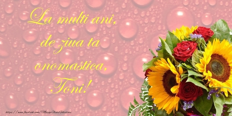 Felicitarea cu floarea soarelui și trandafiri roșii de Ziua Numelui este un cadou gândit special pentru sărbătoare numelui Toni. Numele Toni devine piesa centrală a acestui dar unic, aducând sărbătoriților un strop de bucurie în aceată zi specială.