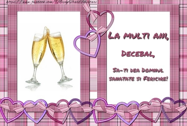 Această felicitare cu inimioare și șampanie din colecția noastră de felicitari de zi de nastere cu numele Decebal are o notă de originalitate și îți oferă ocazia să faci o persoană să se simtă specială datorită faptului că acolo este numele ei. Felicitarea se poate descărca gratuit sau se poate trimite prin Whatsapp, Facebook, Twitter, Pinterest. Imagine de zi de nastere cu inimioare și șampanie cu dimensiunile 600px x 403px și cu textul La multi ani, Decebal, sa-ti dea Domnul sanatate si fericire!.
