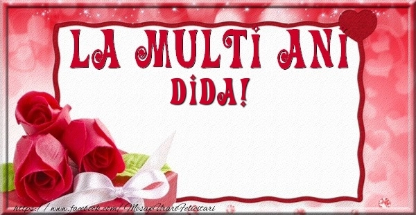 Felicitarea cu inimioare pe fundal cu trei trandafiri roșii si fundă este ca o explozie de bucurie și culoare, iar numele Dida este adăugat cu gingășie pentru a personaliza această experiență de sărbătoare. Este modul tău de a spune la mulți ani într-un mod unic și special!