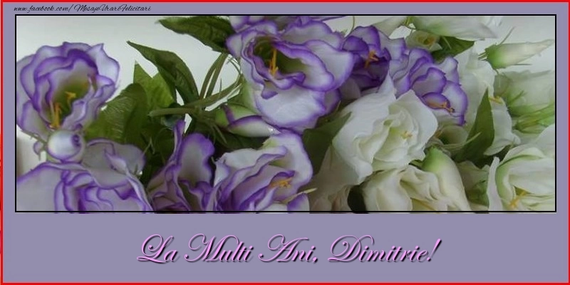 Această felicitare cu flori pe fundal mov din colecția noastră de felicitari de la multi ani cu numele Dimitrie are o notă de originalitate și îți oferă ocazia să faci o persoană să se simtă specială datorită faptului că acolo este numele ei. Felicitarea se poate descărca gratuit sau se poate trimite prin Whatsapp, Facebook, Twitter, Pinterest. Imagine de la mulți ani cu flori pe fundal mov cu dimensiunile 800px x 400px și cu textul La multi ani, Dimitrie!.