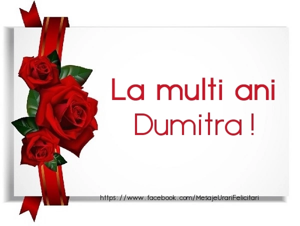 Această felicitare cu fundal cu fundă roșie și trei trandafiri roșii din colecția noastră de felicitari de la multi ani cu numele Dumitra are o notă de originalitate și îți oferă ocazia să faci o persoană să se simtă specială datorită faptului că acolo este numele ei. Felicitarea se poate descărca gratuit sau se poate trimite prin Whatsapp, Facebook, Twitter, Pinterest. Imagine de la mulți ani cu fundal cu fundă roșie și trei trandafiri roșii cu dimensiunile 600px x 452px și cu textul La multi ani Dumitra.