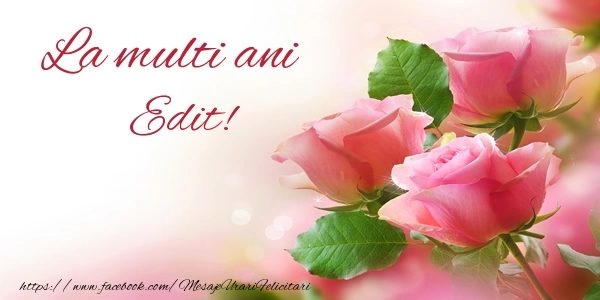 Această felicitare cu trandafiri pentru fete sau femei din colecția noastră de felicitari de la multi ani cu numele Edit are o notă de originalitate și îți oferă ocazia să faci o persoană să se simtă specială datorită faptului că acolo este numele ei. Felicitarea se poate descărca gratuit sau se poate trimite prin Whatsapp, Facebook, Twitter, Pinterest. Imagine de la mulți ani cu trandafiri pentru fete sau femei cu dimensiunile 600px x 300px și cu textul La multi ani Edit!.