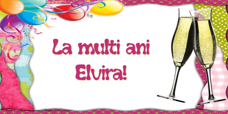 Felicitarea cu pahare de șampanie și baloane colorate pentru petrecere este ca o explozie de bucurie și culoare, iar numele Elvira este adăugat cu gingășie pentru a personaliza această experiență de sărbătoare. Este modul tău de a spune la mulți ani într-un mod unic și special!